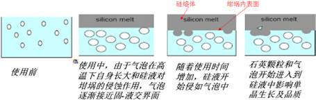 石英坩堝的內(nèi)表面氣泡含量坩堝最內(nèi)表層是指透明層中最靠近內(nèi)表面1-2mm的部分。圖中表明了在使用過程中,坩堝對硅液起作用的機理--由于與硅液接觸的內(nèi)表面不斷向硅液中熔... -